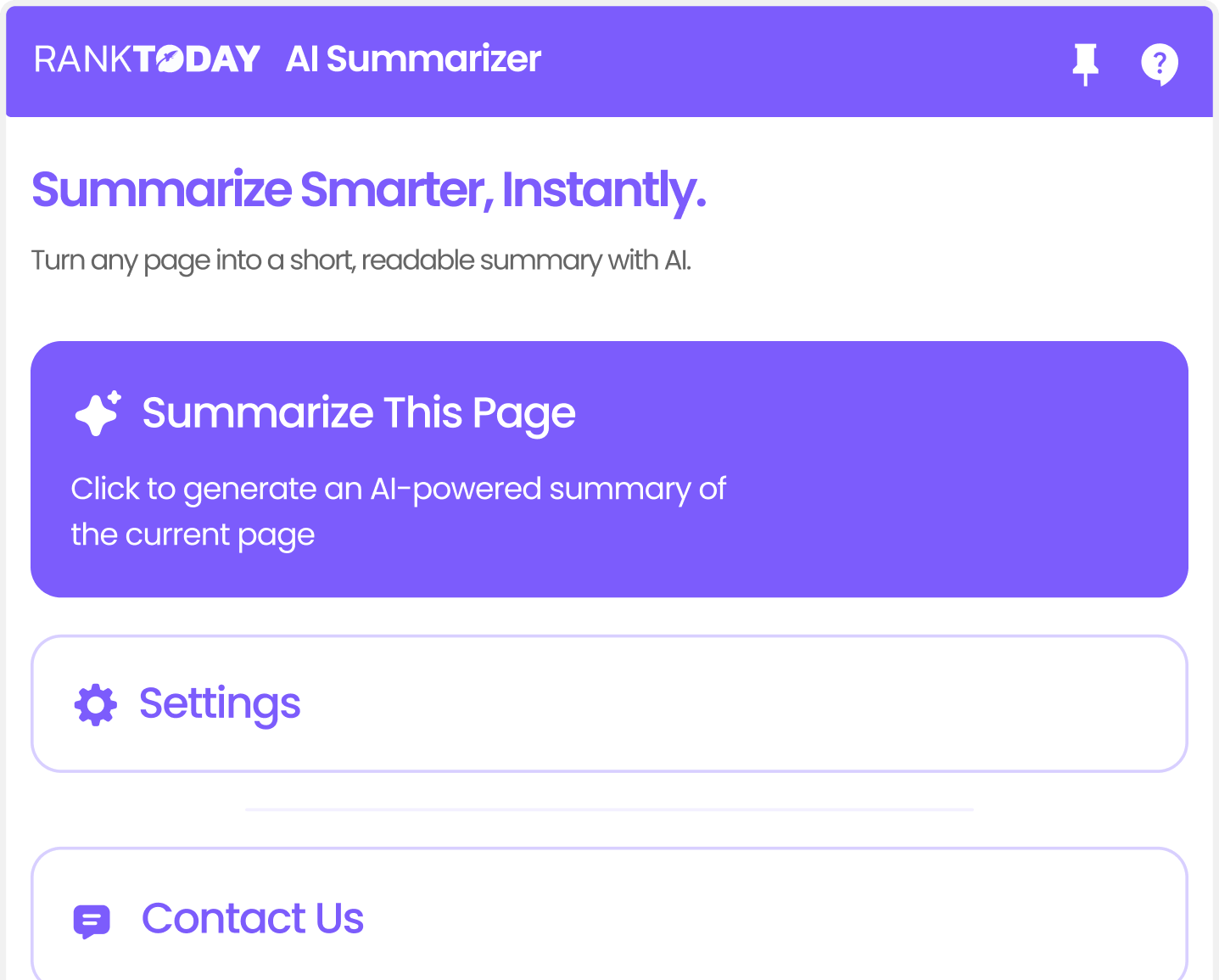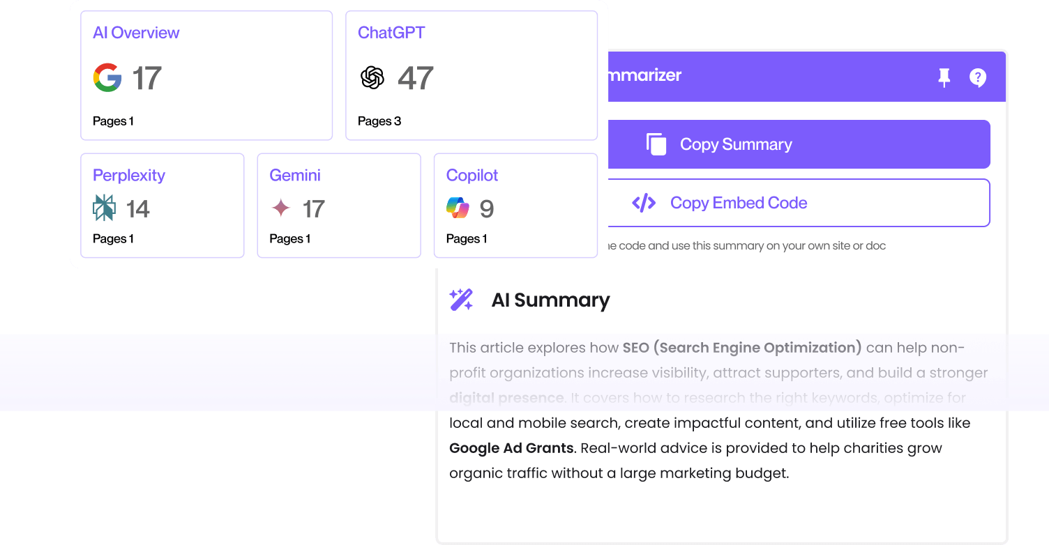 Boost rankings and get discovered on AI engines with instant, structured summaries for every page.